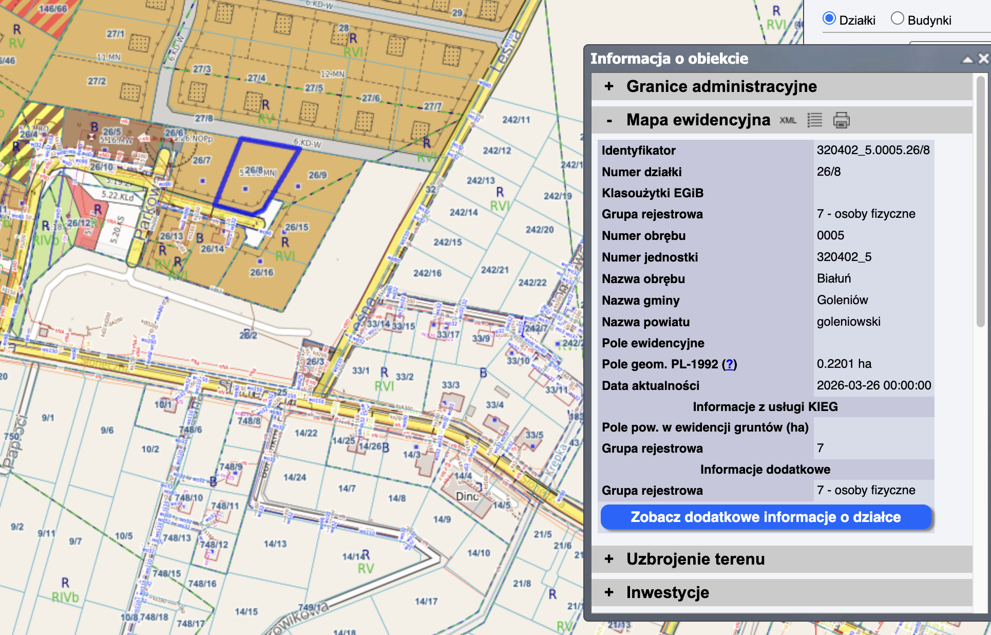 Na sprzedaż duża działka o powierzchni ok. 2200 m² położona w prężnie rozwijającej się miejscowości w pobliżu Goleniowa. W miejscowości znajduje się szkoła, przedszkole, dworzec PKP, sklep Dino, plac zabaw oraz boiska, a dodatkowym atutem jest budowa nowej świetlicy i rozwijająca się ścieżka rowerowa. Działka posiada dostęp do wszystkich mediów (woda, prąd, kanalizacja), dojazd drogą gminną oraz obowiązujący Miejscowy Plan Zagospodarowania Przestrzennego umożliwiający zabudowę jednorodzinną bez konieczności uzyskiwania warunków zabudowy. Na terenie znajdują się drzewa, co daje możliwość stworzenia wyjątkowego ogrodu i zapewnia kameralny charakter nieruchomości.